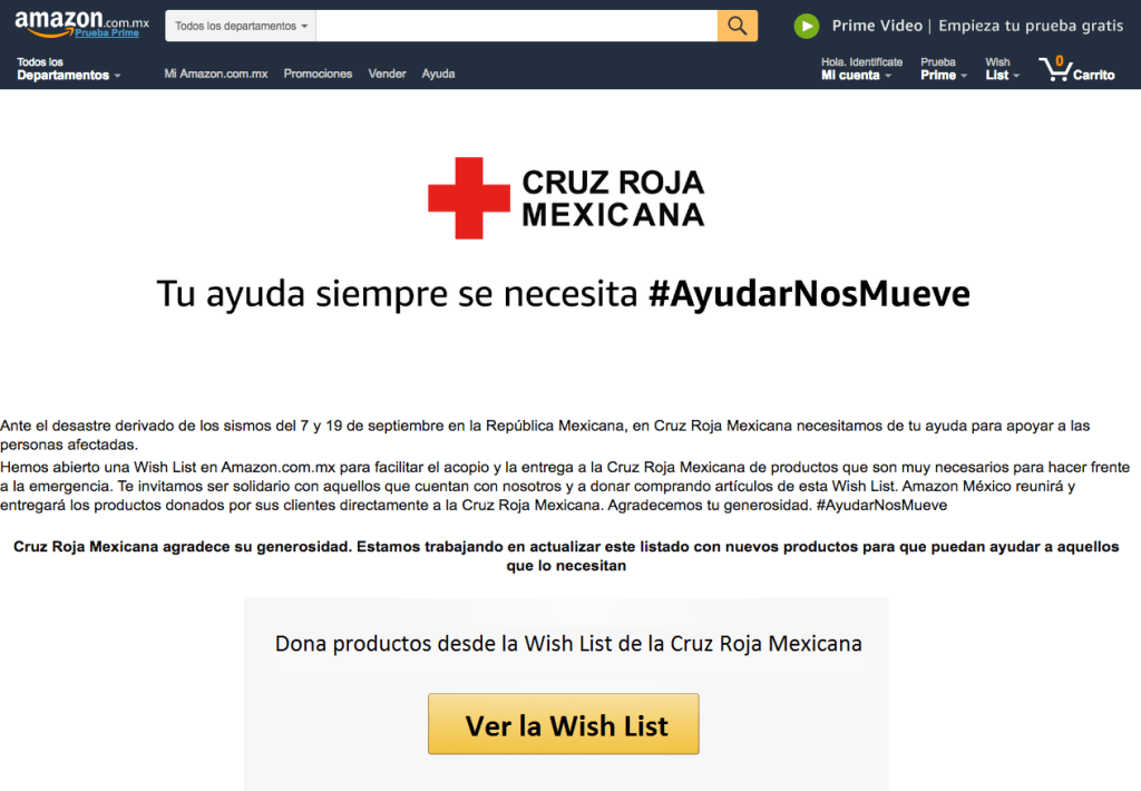 Hemos abierto una Wish List en Amazon.com.mx para facilitar el acopio y la entrega a la Cruz Roja Mexicana de productos que son muy necesarios para hacer frente a la emergencia. Te invitamos ser solidario con aquellos que cuentan con nosotros y a donar comprando artículos de esta Wish List. Amazon México reunirá y entregará los productos donados por sus clientes directamente a la Cruz Roja Mexicana. Agradecemos tu generosidad. #AyudarNosMueve