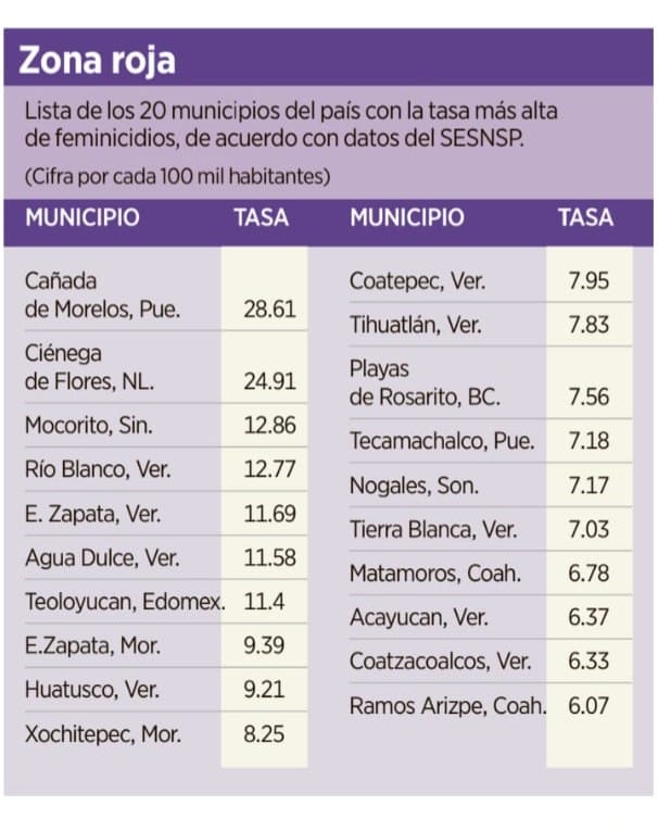 Nueve son los municipios que se encuentran entre los 20 municipios del país con más feminicidios.