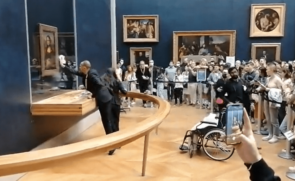 Los vigilantes del recinto limpiaron rápidamente el cristal, momento que ha quedado registrado en vídeos y fotos de las decenas visitantes que se encontraban en el lugar. La intención y la identidad del atacante no ha trascendido. Según esos testigos, se trataba de una persona que se acercó al cuadro en silla de ruedas camuflado bajo una peluca.