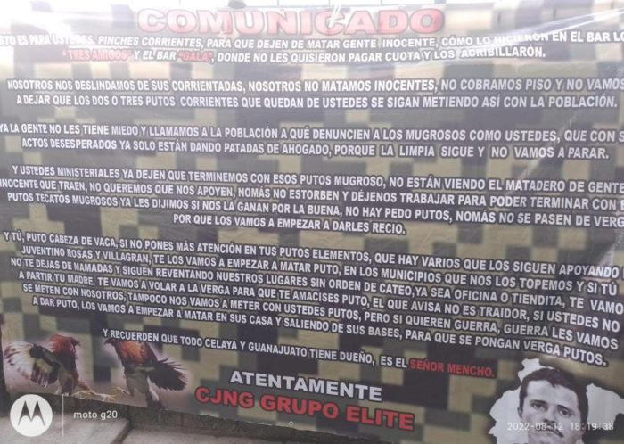 Los narcomensajes están firmados por el Cartel Jalisco Nueva Generación (CJNG) Grupo Elite y se deslindan de las masacres ocurridas en días pasados en el bar ‘Los Tres Amigos‘ donde fueron asesinadas 9 personas, así como el ataque al bar ‘Hotel Gala’ donde 12 personas fueron ejecutadas.