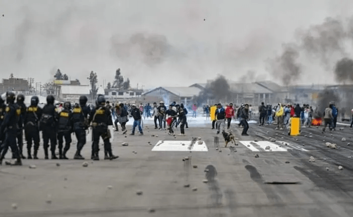 Cientos de manifestantes bloquean la pista de aterrizaje del aeropuerto de Arequipa, Perú, en demanda de la renuncia de la presidenta Dina Boluarte, pese a su anuncio de que intentará adelantar elecciones para abril de 2024.