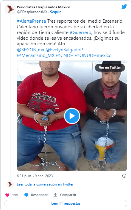 Dos de los tres periodistas del medio Escenario Calentano, quienes fueron vistos por última vez el pasado 27 de diciembre, fueron exhibidos en un video, de 41 segundos, donde se les observa encadenados de pies y manos.