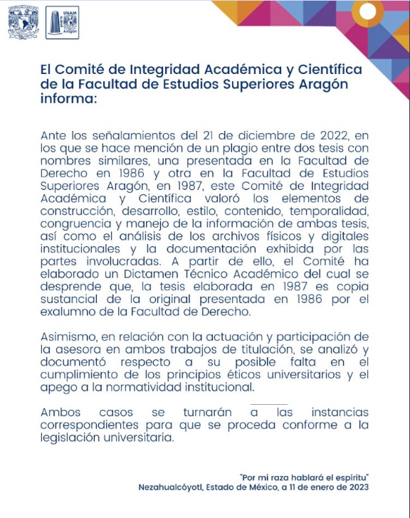La Facultad de Estudios Superiores FES Aragón concluye que la tesis de la ministra Yasmín Esquivel Mossa con el cual obtuvo su licenciatura en Derecho es copia sustancial de otra de otra.