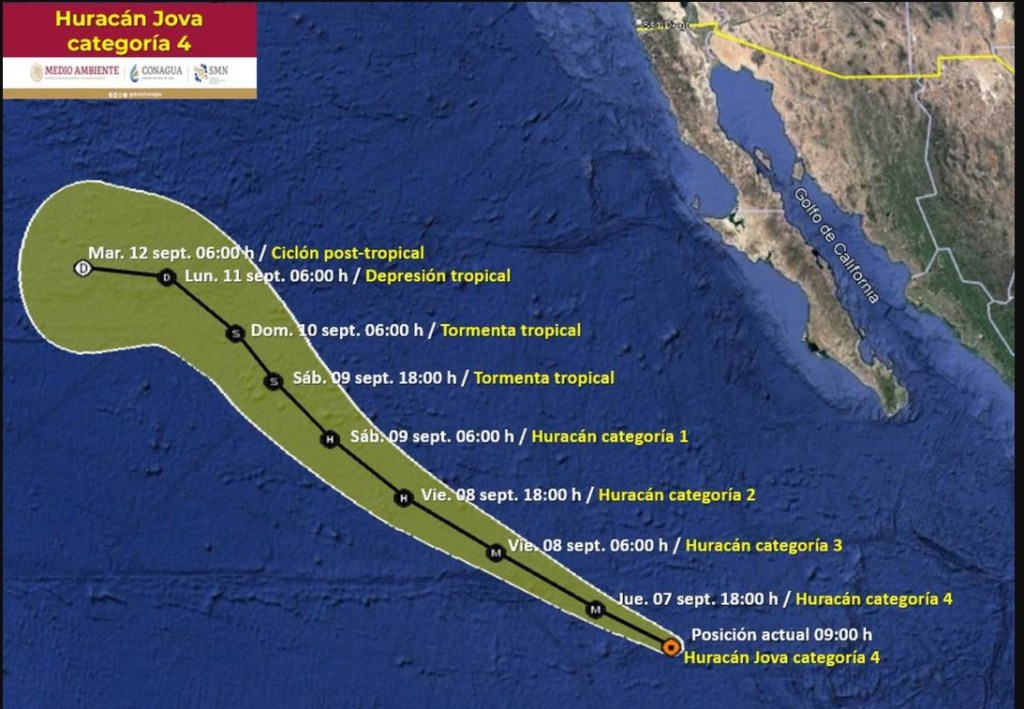 Para el sábado 9 de septiembre, Jova será tormenta tropical y el martes 12 de septiembre se degradará a ciclón post tropical.