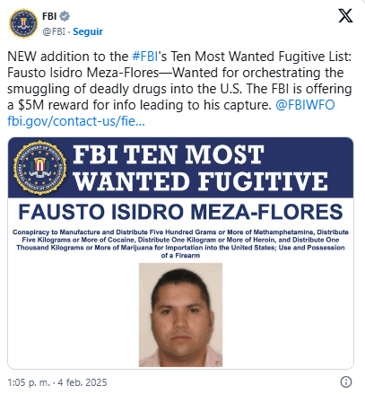 El Buró Federal de Investigaciones (FBI) ascendió a Fausto Isidro Meza Flores, mejor conocido como “Chapo Isidro”, en su lista de 10 fugitivos más buscados; la agencia lo investiga por el tráfico de “grandes cantidades” de heroína, metanfetamina, cocaína, fentanilo y mariguana, y ofrece 5 millones de dólares por información que conduzca a su arresto o su condena.