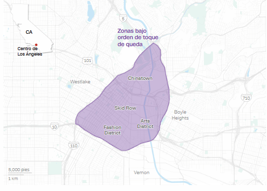 El área del centro de Los Ángeles donde se aplica el toque de queda es de 1 milla cuadrada (2,6 kilómetros cuadrados), según la alcaldesa Karen Bass. La superficie total de la ciudad es de 502 millas cuadradas (1.300 km²), señaló.